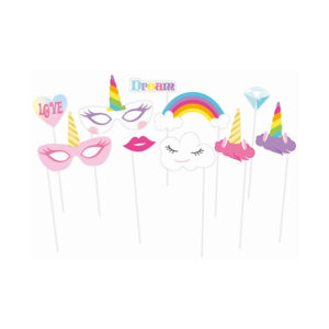 Opakowanie zawiera 10 x Rekwizyty do Zdjęć, takie jak między innymi: róg jednorożca, tęczę, chmurkę, usta, diament, napis: “Dream” i “Love”.Idealne na Imprezę dla Dzieci!