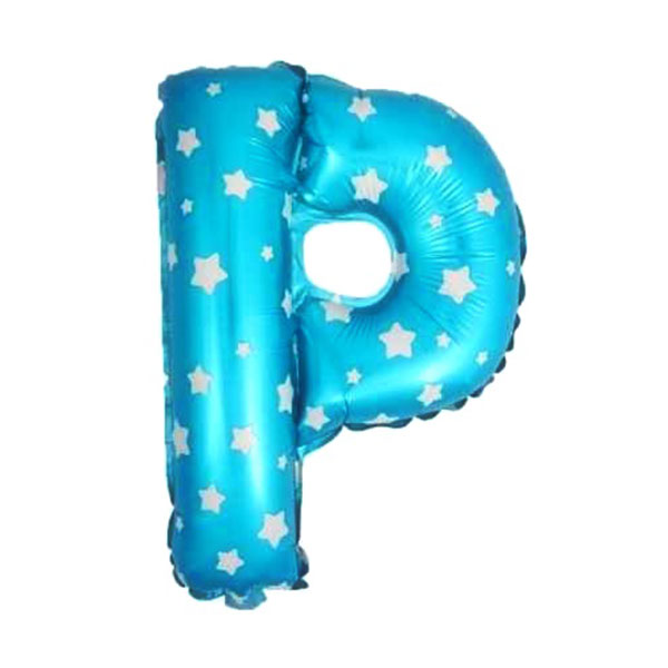 Balon Foliowy Litera “P”, w kolorze niebieskim, z białymi gwiazdkami.