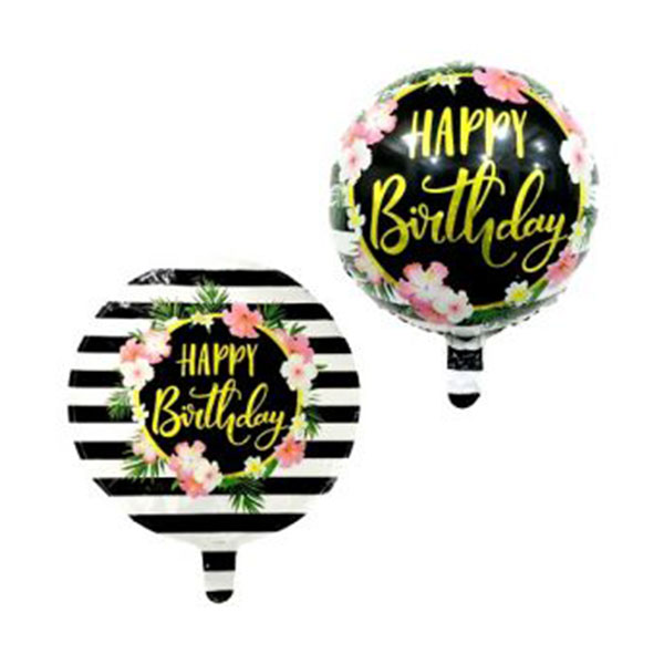 Okrągły w Czarno Białe Paski Balon Foliowy z Nadrukiem Happy Birthday z Motywem Kwiatów – Idealnie sprawdzi się jako dekoracja dla najbardziej wymagających Solenizantów !! 🙂