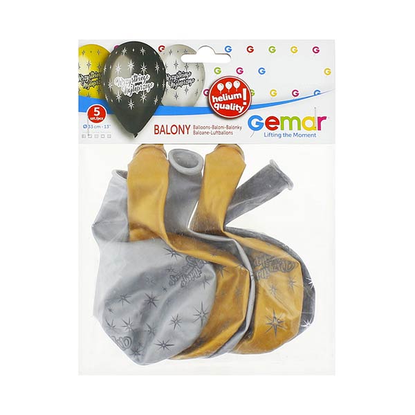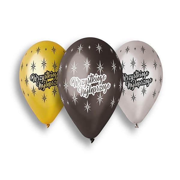 W opakowaniu znajdują się 2 balony złote, 2 balony srebrne oraz 2 balony czarne – Balony z miłym, urodzinowym nadrukiem Wszystkiego Najlepszego.