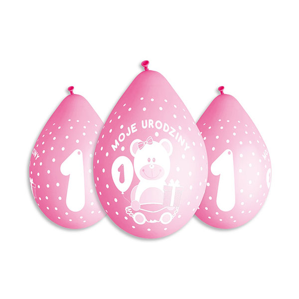 Balony z nadrukiem 1 + Moje Urodziny – różowe – 5 sztuk – 12” – wiszące