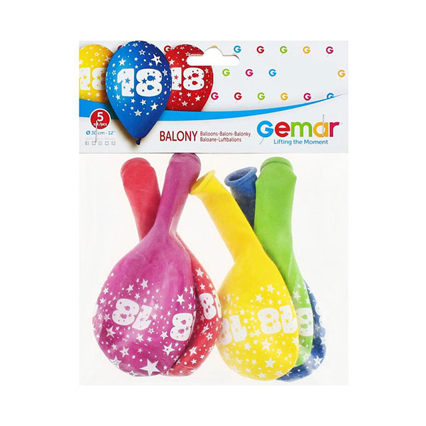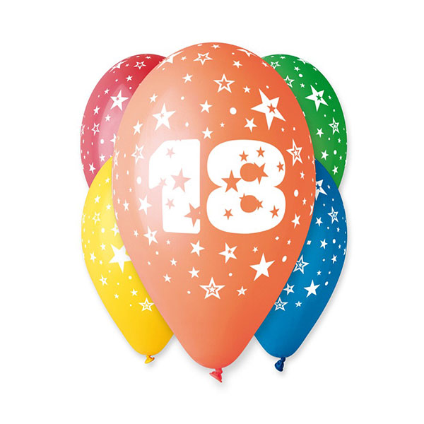 W opakowaniu znajduje się 5 pastelowych różnokolorowych balonów z liczbą “18”