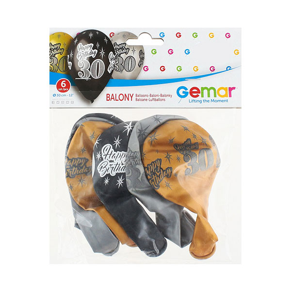 Balony z nadrukiem – Happy Birthday 30 – 12 cali – Metaliczne – 6 sztuk