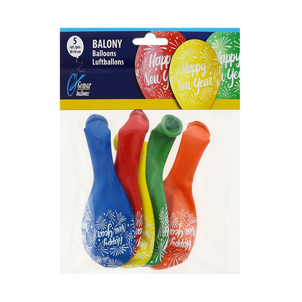 W opakowaniu znajduje się 5 sztuk kolorowych balonów z motywem noworocznym – niebieski, czerwony, pomarańczowy, żółty, zielony.