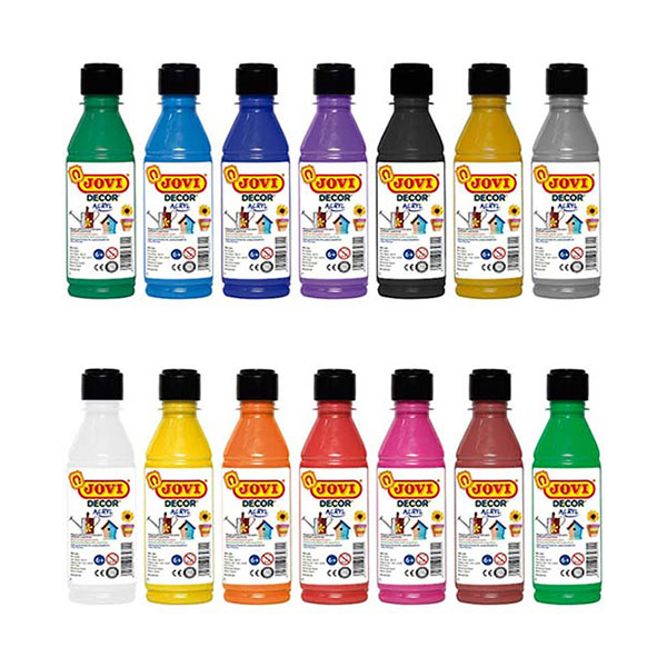 Farby dekoracyjne firmy JOVI, dostępne w czternastu intensywnych kolorach, są przeznaczone do malowania na wszystkich rodzajach powierzchni – tkaninach, ubraniach, drewnie, metalu. Farby po wyschnięciu są odporne na wodę. Dobrze i jednolicie kryją, doskonale nadają się do malowania przedmiotów wykonanych z mas plastycznych JOVI. Zestaw zawiera czternaście farbek w butelkach o pojemności 250ml.