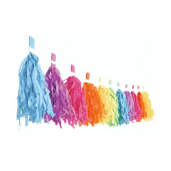 Piękna girlanda w kształcie tęczowych frędzelków, nada wyjątkowego klimatu oraz wyjątkowego kolorytu organizowanego przez Ciebie przyjęcia!