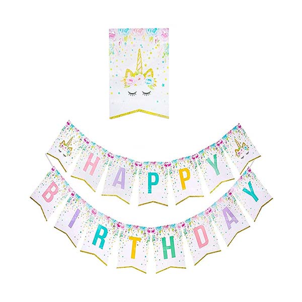 Piękna girlanda urodzinowa z napisem Happy Birthday z motywem jednorożców. Idealna na urodziny z jednorożcem!
