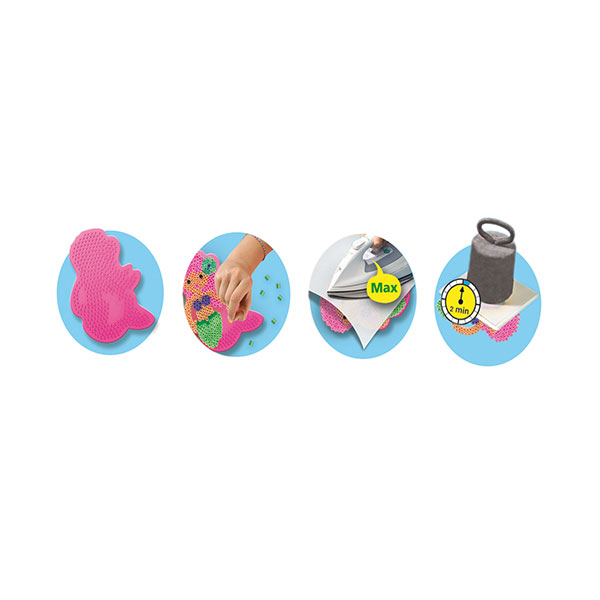 Instrukcja: na podkładce należy z koralików ułożyć wzór, następnie przeprasować koraliki żelazkiem przez załączony papier, zaprasowany element trzeba umieścić pod ciężkim przedmiotem na 2-3 min i gotowe!