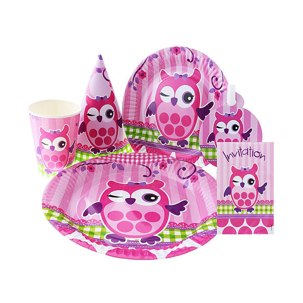 Zestaw różowych, jednorazowych kubeczków z wizerunkiem sowy.