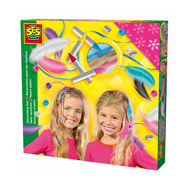 W Zestawie Mała Fryzjerka – znajdują się cztery specjalne kredki do malowania włosów w kolorach: różowym, niebieskim, żółtym, czerwonym, które są łatwo zmywalne wodą oraz przeróżne ozdoby do włosów i fantastycznych fryzur – piórka, koraliki, tasiemki, wstążeczki… – które pozwolą wykonać fantazyjne, bajkowe i kolorowe fryzury.