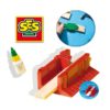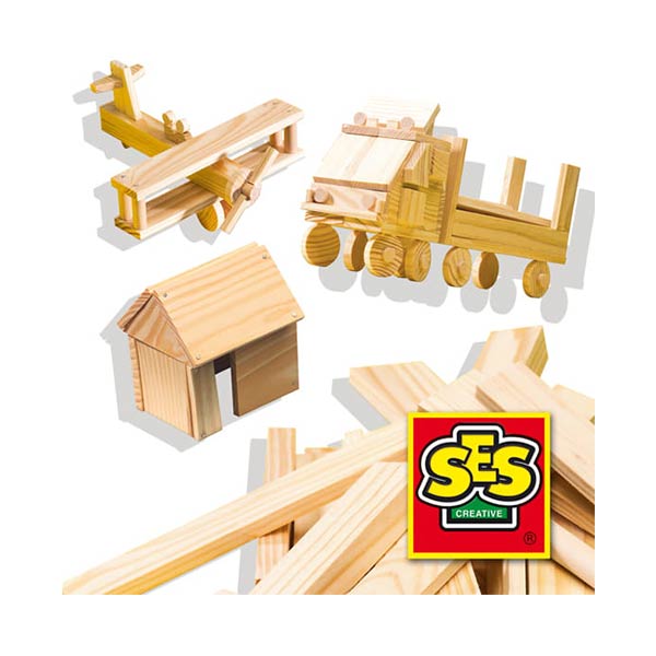 Zestaw zawiera: drewniane deseczki, kołki, kółka, młotek, piłkę, gwoździe, klej, łapkę do wbijania gwoździ, korytko, ołówek.