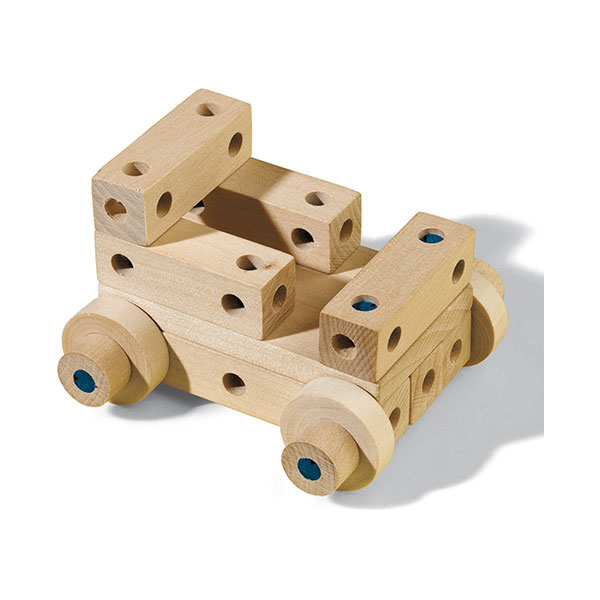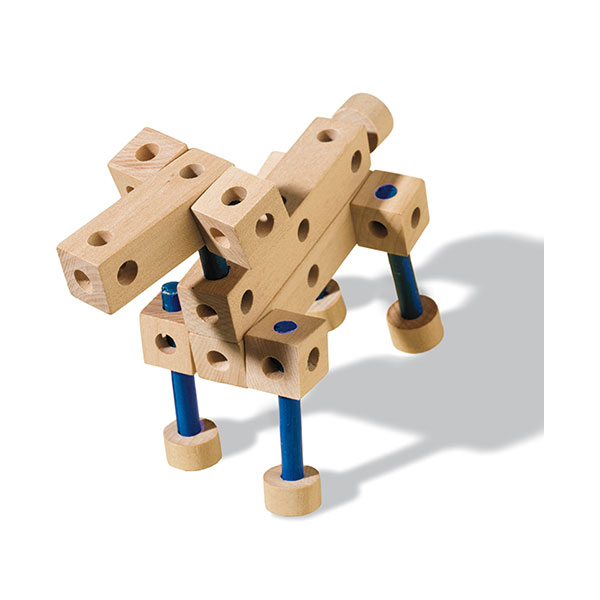 Zestaw składa się z 95 elementów. Zawiera klocki, młoteczek i pałeczki do łączenia poszczególnych elementów.