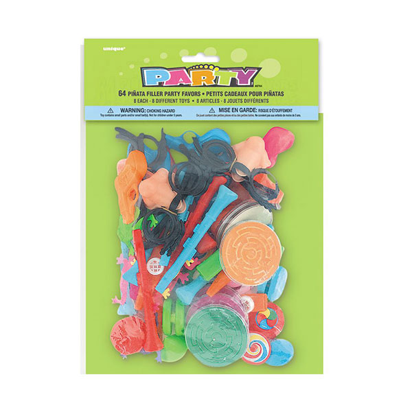Wypełniacz do piniaty zawiera 64 zabawki, między innymi: bączki, mini frisbee, medale, figurki zwierząt, mini gry, jojo, okulary.