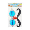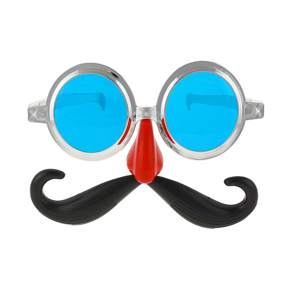 z niebieskimi szkiełkami, czerwonym nosem oraz czarnymi wąsami.
