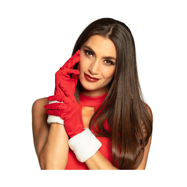 Rękawice Pani Mikołajowa wykonane są z czerwonej tkaniny oraz białego futerka.