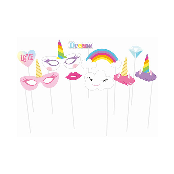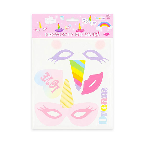 Opakowanie zawiera 10 x Rekwizyty do Zdjęć, takie jak między innymi: róg jednorożca, tęczę, chmurkę, usta, diament, napis: “Dream” i “Love”.