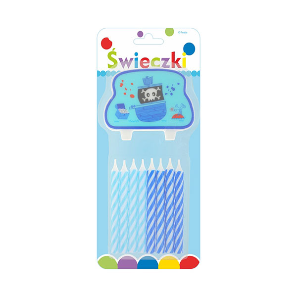 niebieski i granatowy + dodatkową, specjalną, zdobioną świeczkę z nadrukiem statku pirackiego z czaszką.