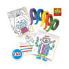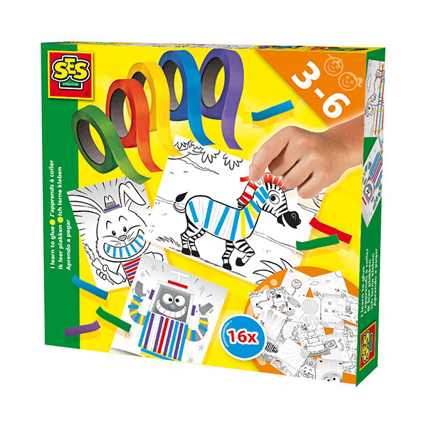 Zestaw do nauki przyklejania zawiera aż 16 arkuszy do wyklejania i kolorowania. Każdy arkusz posiada odpowiednie paski – specjalnie wydzielone miejsce w którym należy nakleić kolorową taśmę.
