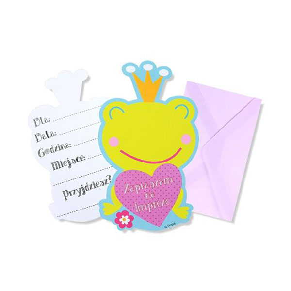 Z jednej strony przedstawiają jaskrawo zieloną księżniczkę – żabkę z koroną, trzymającą serce. Z drugiej strony nadrukowane są pola do wypisania zaproszenia własnoręcznie przez Twoje Dziecko.