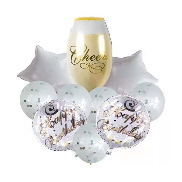Piękny zestaw idealnie dopasowanych do siebie kolorystycznie, balonów foliowych, którym centralnym punktem, jest balon z kieliszkiem szampana. Idealny do dekoracji celebracji pięknych momentów życia.
