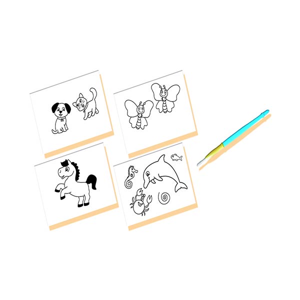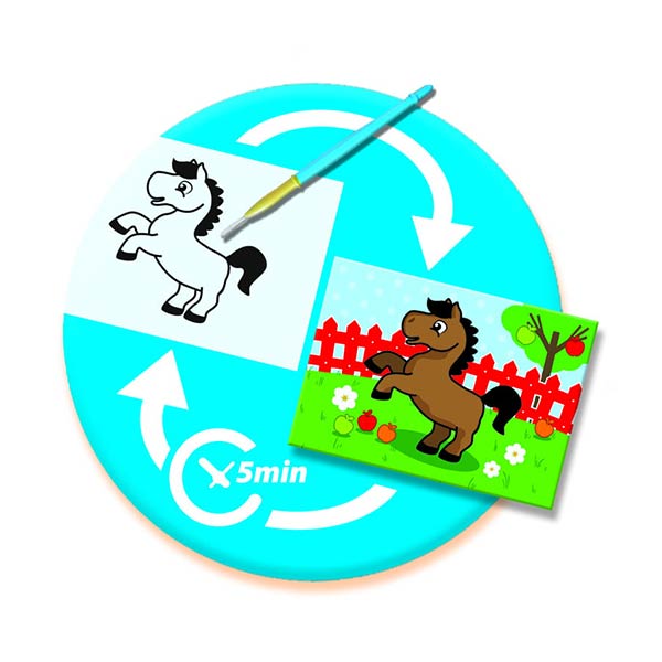 Odkrywaj kolory przy użyciu mokrego pędzelka. Poczekaj parę minut do wyschnięcia i koloruj od początku. Magiczne kolorowanie bez bałaganu.