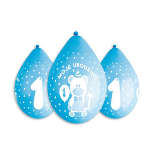Balony z nadrukiem 1 + Moje Urodziny – niebieskie – 5 sztuk – 12” – wiszące
