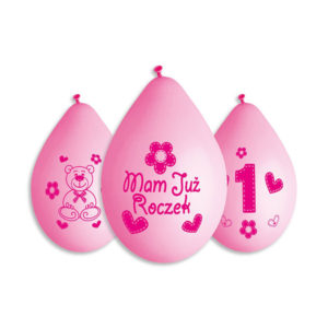Balony z nadrukiem Cyfra 1 + nadruk Mam Już Roczek – różowe – 5 sztuk – 12” – wiszące