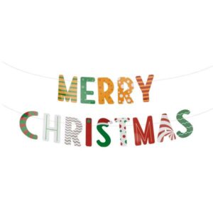 Baner z literami tworzącymi napis Merry Christmas. Każda z liter ma inny kolor i grafikę, dzięki czemu przykuwa uwagę i zachęca do dokładnego jego obejrzenia. baner będzie wspaniałą dekoracją na świątecznych spotkaniach.- Wysokość liter: 20 cm